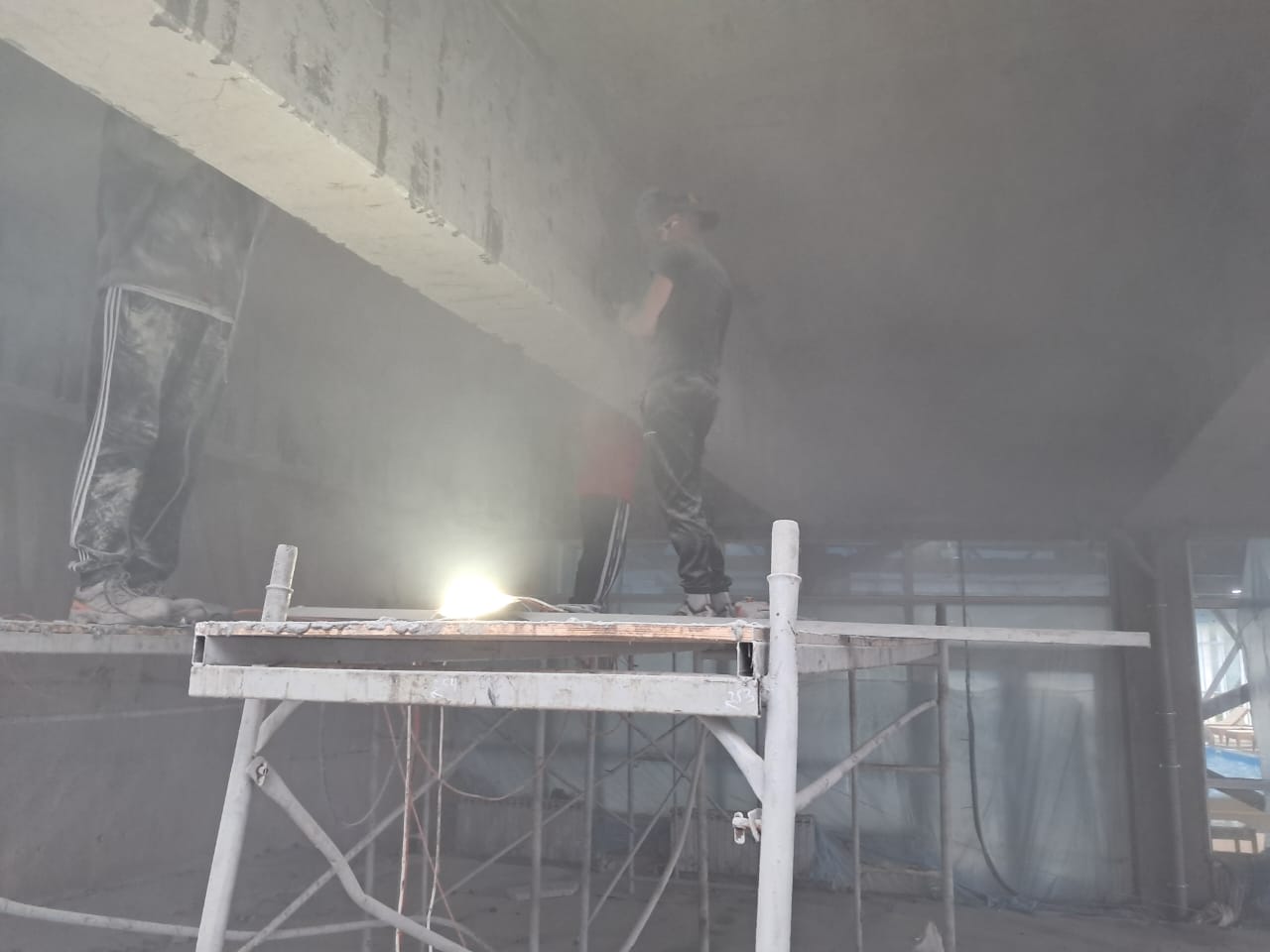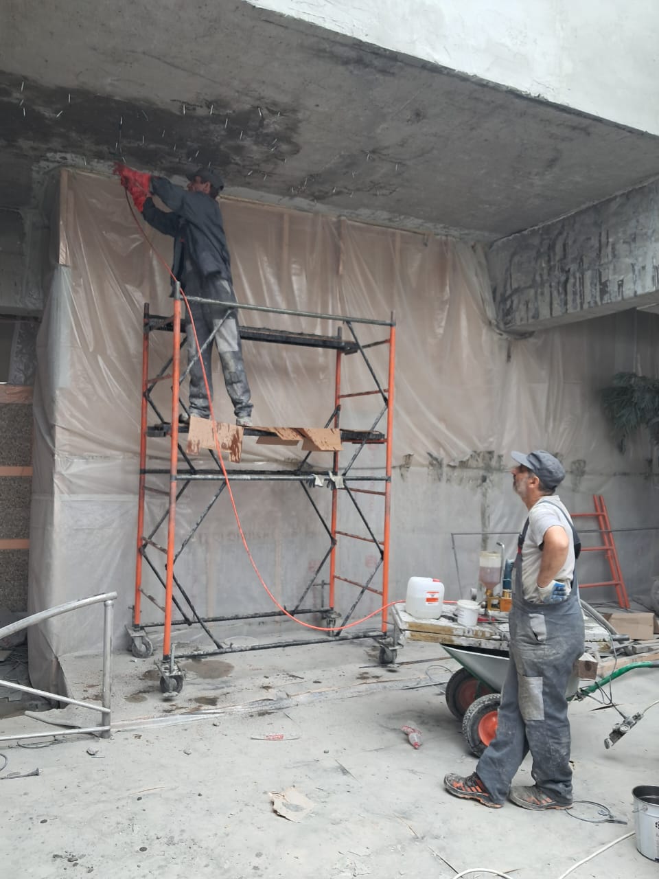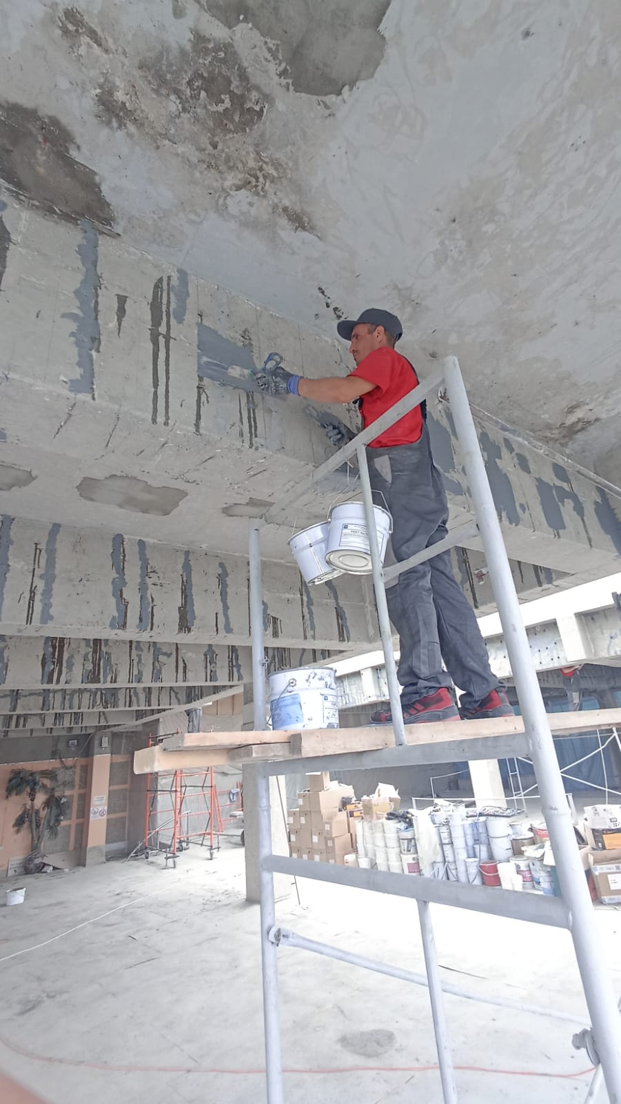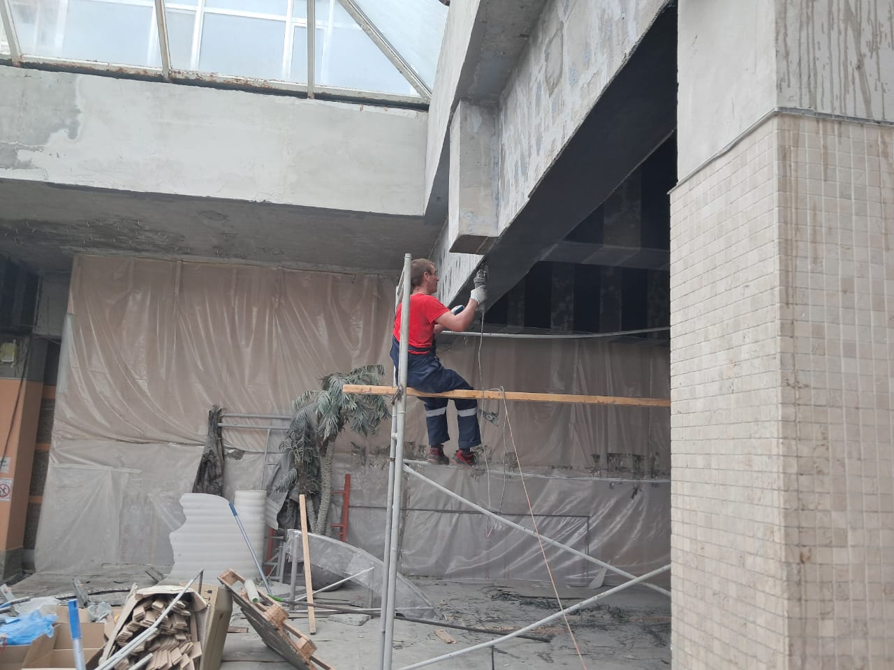 Демонтаж разрушенного защитного слоя бетона на плите перекрытия и зачистка арматуры от ржавчины. Покрытие очищенной арматуры антикорозионным составом. Усиление несущей способности ригельных балок перекрытия методом иньектирования эпоксидных смол в трещины, гидроизоляция бассейнов с тёплой морской водой, усиление колон и балок композитными материалами и углеволокном.
